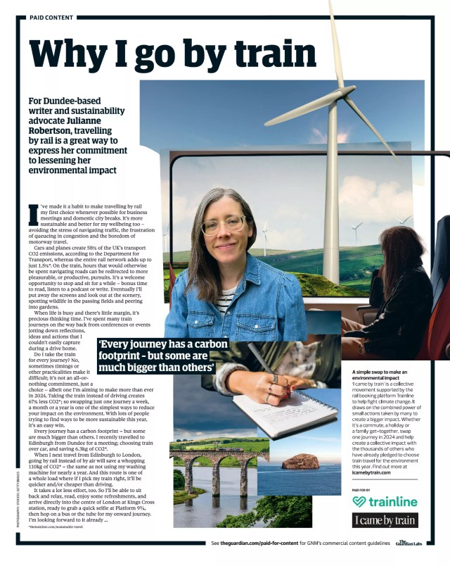 I also specialise in branded content, writing features on sustainability and wellbeing published by The Guardian for their clients Trainline and Boots.